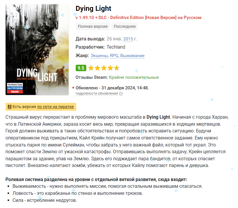 Страшный вирус перерастает в проблему мирового масштаба в Dying Light. Начиная с города Харран, что в Латинской Америке, зараза косит весь мир, превращая заразившихся в ходящих мертвецов. Герой должен выживать в таких обстоятельствах и попробовать исправить ситуацию. Будучи оперативником под прикрытием.