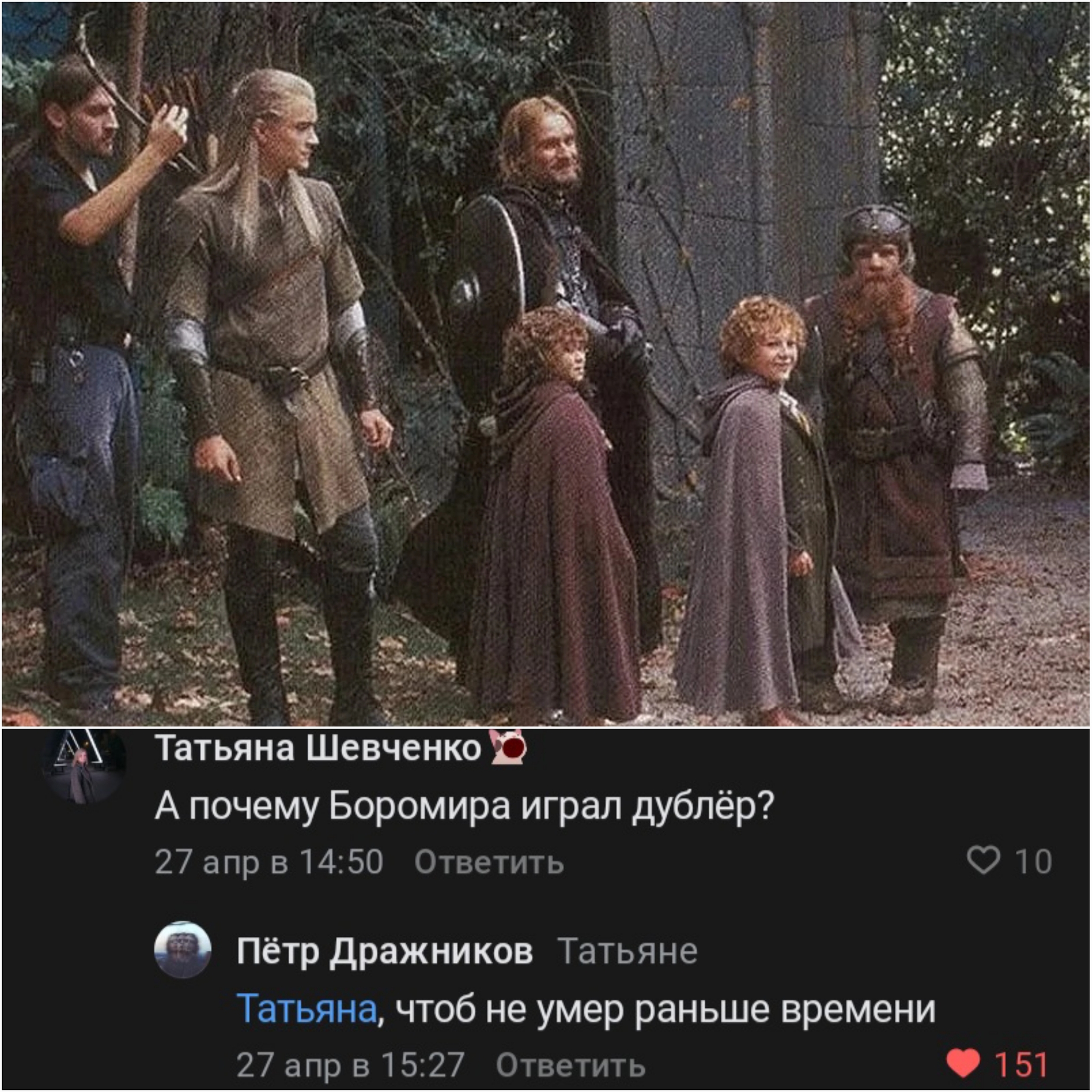104 Agnitushitel 6 месяцев назад Средиземье - мир Толкина Да будь у вас хоть 10'000 дублеров - вы не справитесь... Комментарии ВКонтакте Картинка с текстом Властелин колец Дублеры Боромир 4 Ещё 0