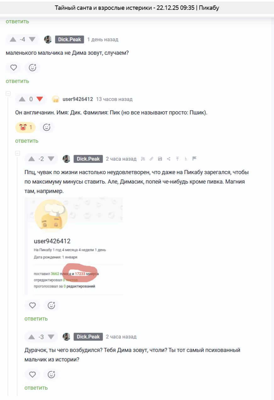 Выложила одна местная гражданка пост Тайный санта и взрослые истерики В посте описывается может быть вымышленная, может быть реальная история, которая случилась в коллективе. И у меня, как у любого ебанутого нормального человека, возникла мысль: "А может быть я знаю этого человека?" (ну или быть может я встречался с подобными случаями, все в нашем мире может быть). Поэтому я спросил у автора про имя, не Дмитрий ли случаем его зовут, так как наблюдал такие истерики у нескольких разных Дмитриев и решил на всякий случай проверить гипотезу. Ни в коем случае не хотел задеть чувства всех Дмитриев на свете. Я их (Дмитриев) всех очень уважаю, особенно Дмитрия Донского, Дмитрия Медведева и даже Лжедмитриев обоих.
