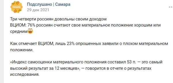 Самой ссылки не нашла, но нашла вот это - декабрь 2022. Тут 76%. И другую тоже, скрины приложила. В дугой за май 2022 - якобы 75%. Не в этом суть - просто хочется узнать у народа - а какой % в реале?Сколько на самом деле довольны своим положением? вообще к мат. положению относят и недвижимость, и прочее, но З/П это основа основ.