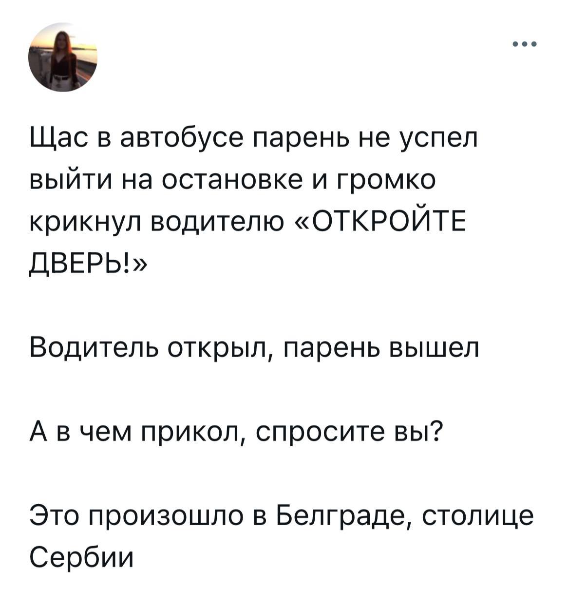 241 terebiata Юмор для всех и каждого Да там по интонации понятно, что надо врата отворить 8 месяцев назад Телеграм канал - https://t.me/roflemem/4840 Скриншот Юмор Сербия Русский язык Telegram (ссылка) 5 1 Ещё 0