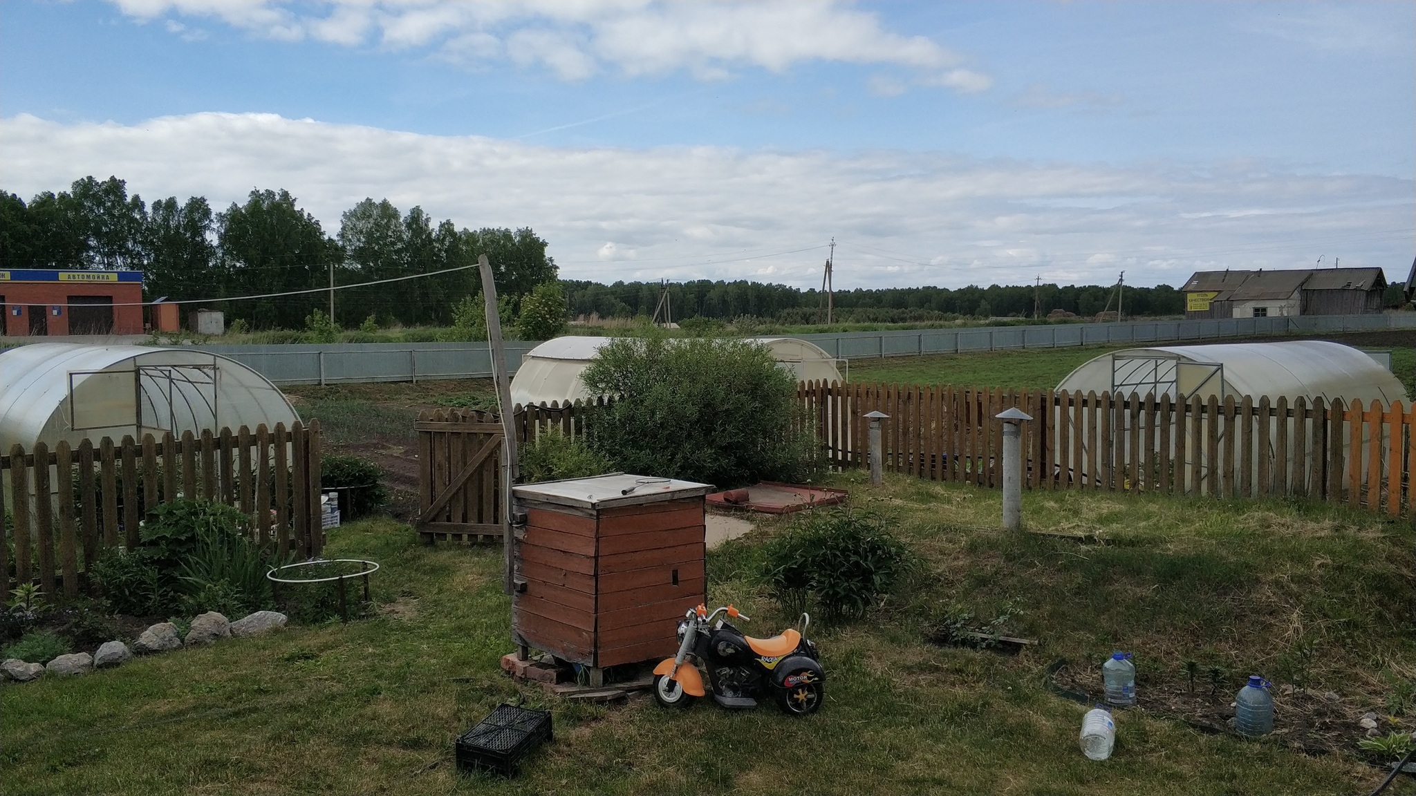 Те самые 3 теплицы, про которые упоминал вначале рассказа. Засажены сплошь помидорами разных сортов + немного баклажанов и перцев. А вот этот "улей" в центре, это домик для скважины)))