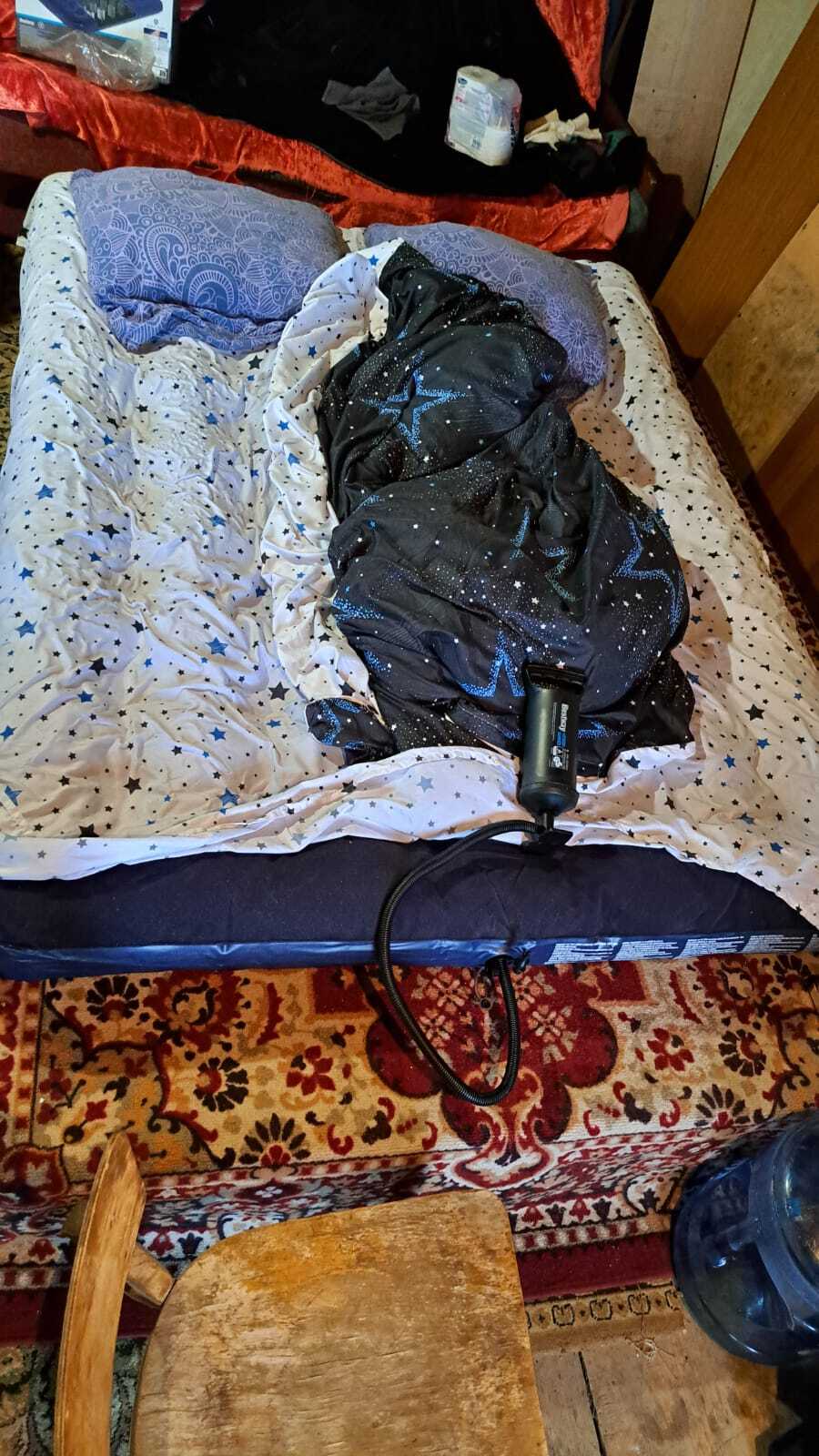 Кровати нормальной там не было, поэтому было принято решение настелить в два слоя паллеты, сверху ковер и надувной матрас)