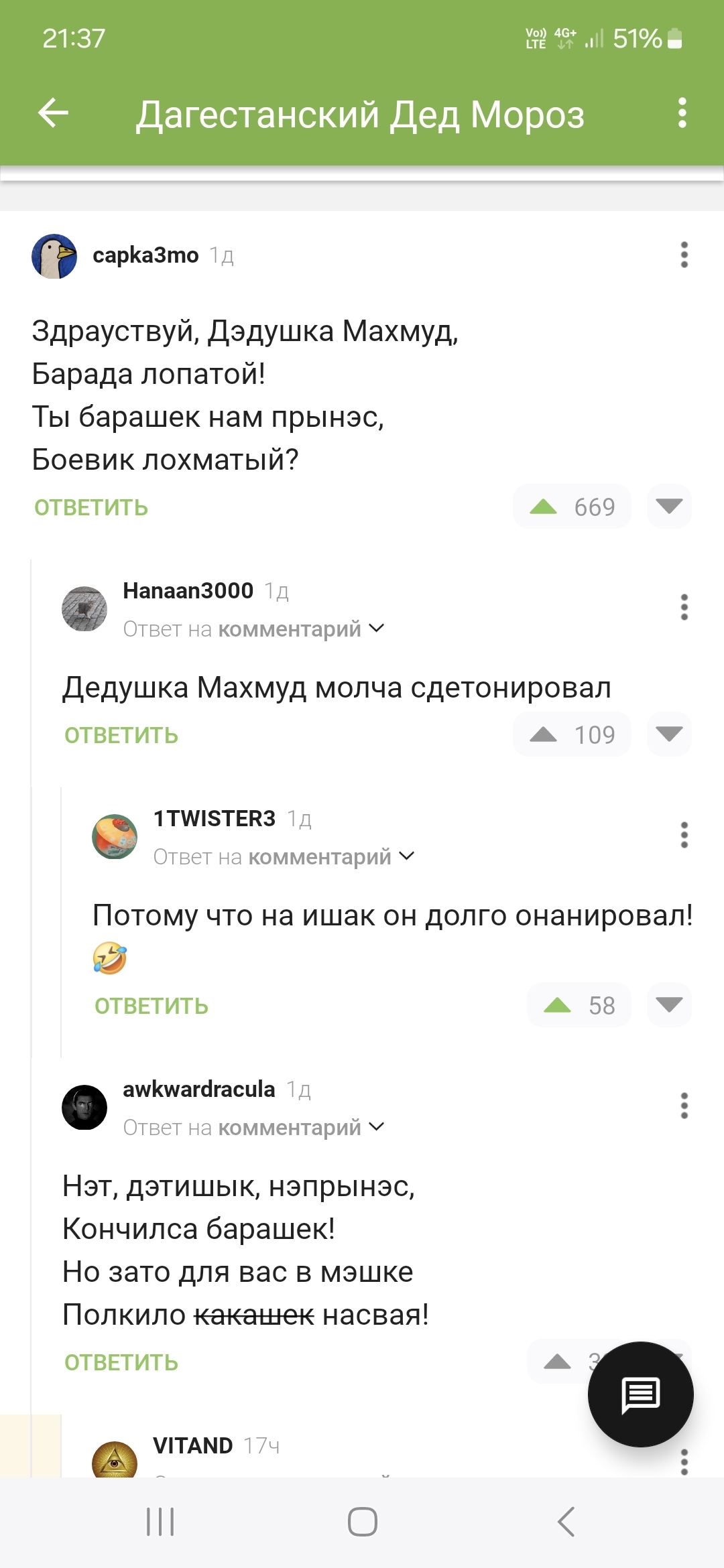 184 Zafhoz 9 месяцев назад Дагестанский дед мороз #comment_334539893 @capka3mo, @Hanaan3000, @1TWISTER3, вы в телевизоре Дед Мороз Новый Год Комментарии на Пикабу Скриншот Юмор Длиннопост 14 3 Ещё 0