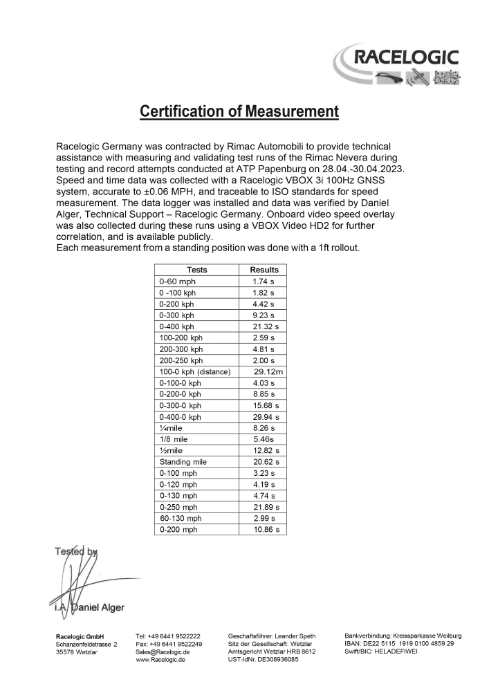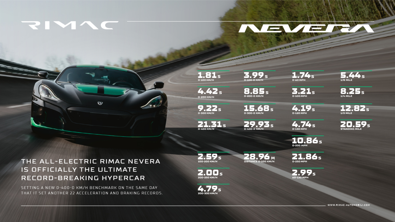 Во время испытаний Rimac Nevera побил 23 рекорда скорости. К примеру, гиперкар разогнался с 0 до 100 км/ч за 1,82 секунды. Во время анонса производитель сообщил, что время разгона будет составлять 1,85 секундны. В рывке с 0 до 400 км/ч и до полной остановки также был установлен новый рекорд — 29,94 секунды. Тормозной путь со 100 км/ч до полной остановки составил 29,12 метра.