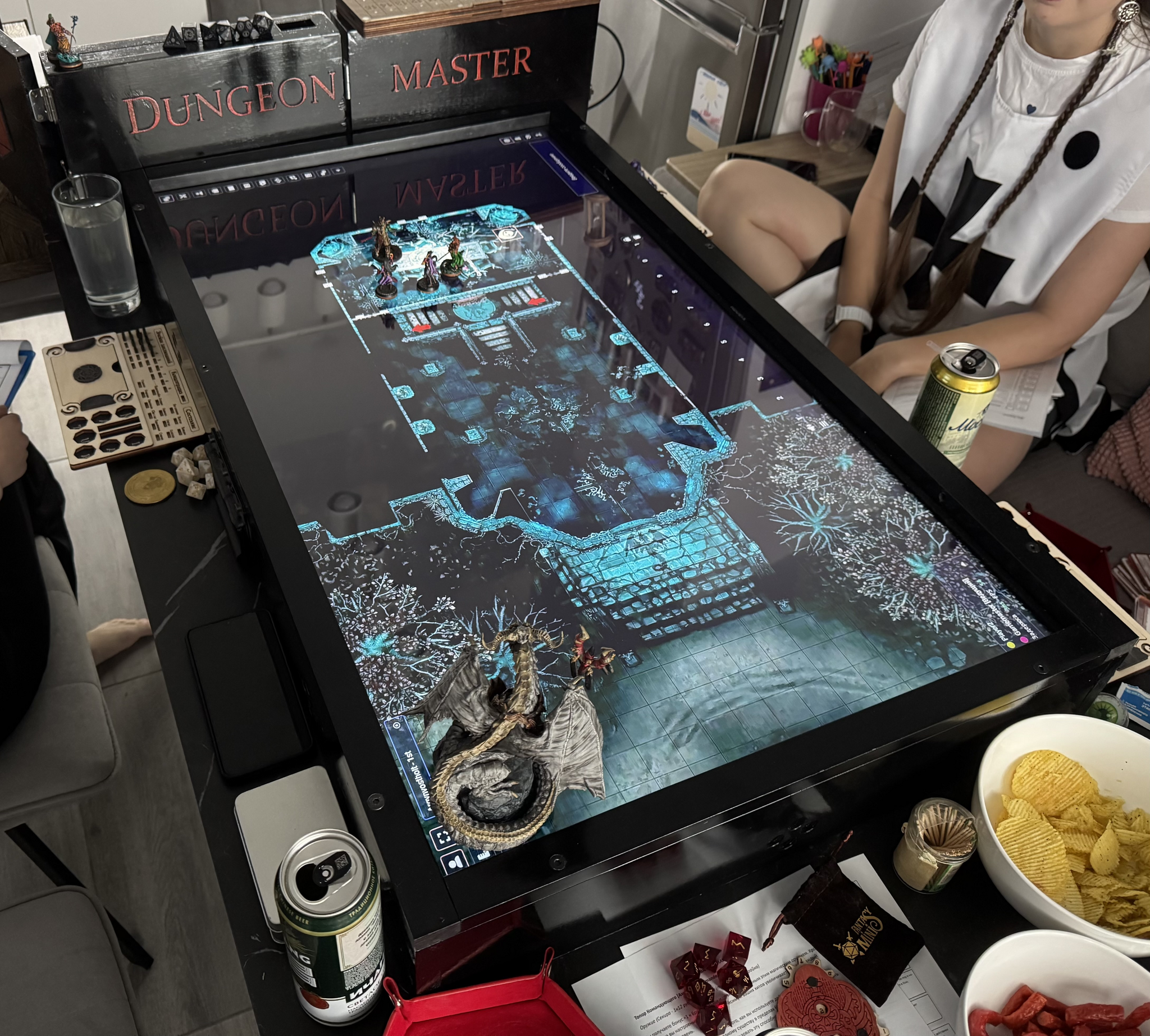 Про техническую составляющую: локальный сервер на Ubuntu с поднятым сервером Foundry VTT (за столом не присутствует)), ноут Win11 (используется для ДМом для администрирования, настройки звуков и прочего), подключенный к ноуту портативный китайски монитор (используется для другого браузера и отзеркаливания на цифровой стол), адаптер для MirrorCast (у меня Surface wireless 4K достался с работы).
