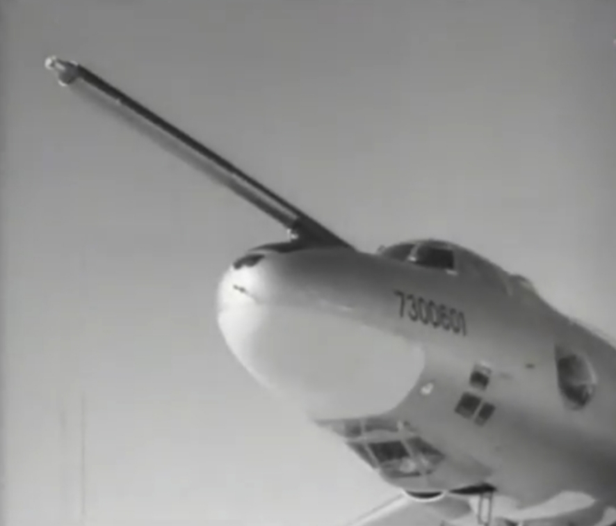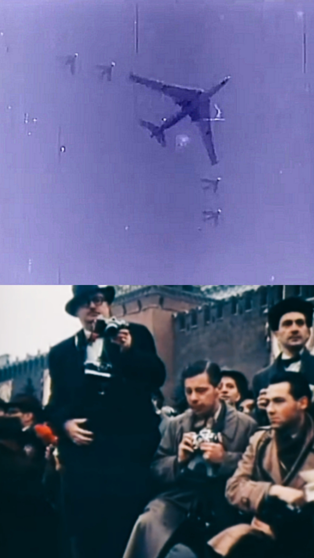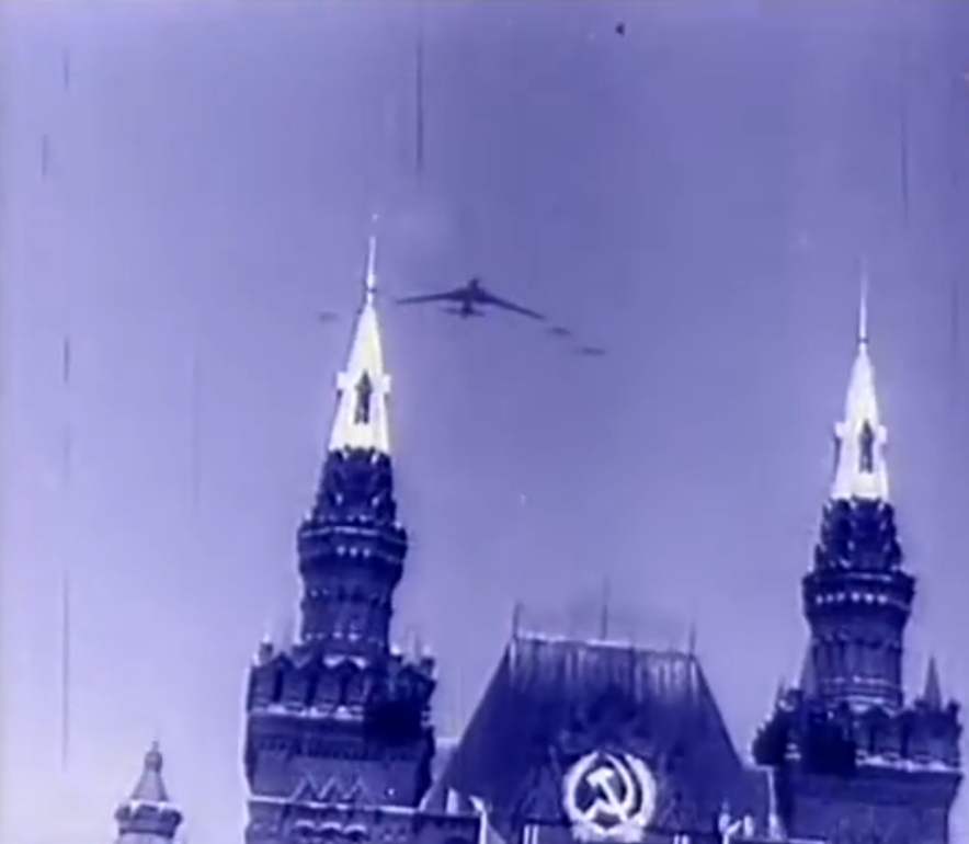 Этот бомбардировщик был столь громаден, что его тень буквально покрывала Красную площадь. Несмотря на свои впечатляющие размеры, самолет легко шел в строю с эскадрильей красных истребителей. Как потом заявило правительство Советского Союза, это был новый реактивный бомбардировщик."