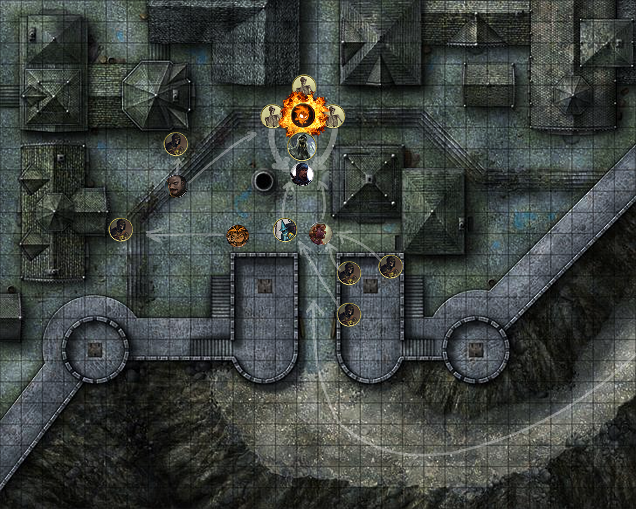 Из-за того, что Солмир и Тамас освещали себе дорогу факелами, а Боб подсвечивал ее посохом, зайдя за крепостные стены мы привлекли к себе внимание небольшого отряда оживших скелетов.