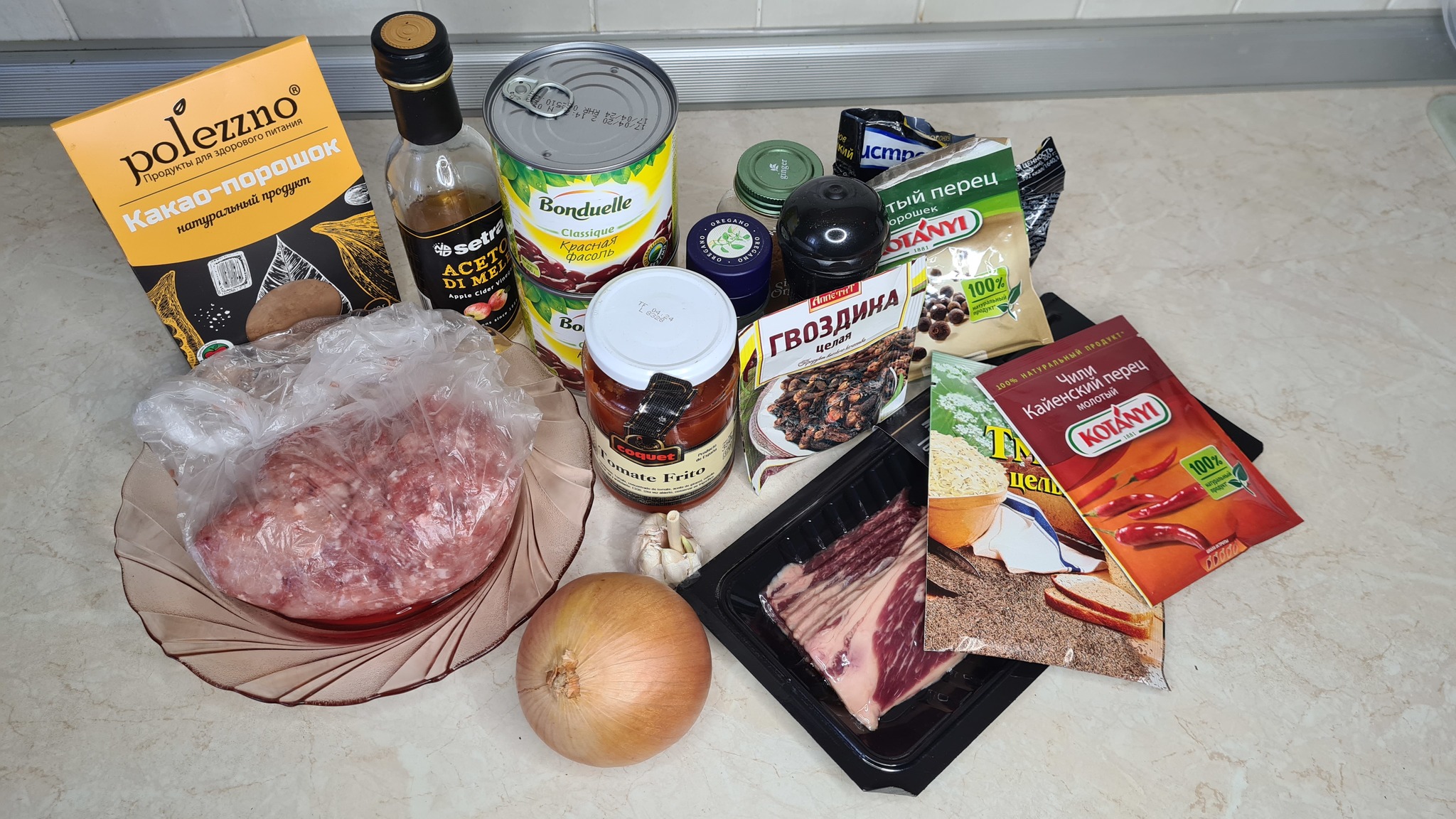 1. В небольшой миске смешайте какао-порошок, порошок чили, корицу, орегано, тмин, душистый перец, гвоздику, кайенский перец, ½ чайной ложки соли и ½ чайной ложки перца. В блендере или кухонном комбайне разотрите половину фасоли с примерно ¾ стакана бульона до однородной массы и отложите в сторону.