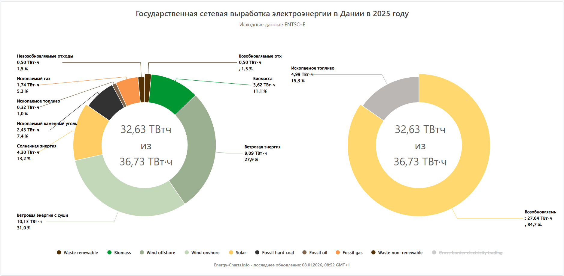 Доля возобновляемой генерации в энергобалансе Дании свыше 80 % основные источники морской и сухопутный ветер, солнце и биогаз.