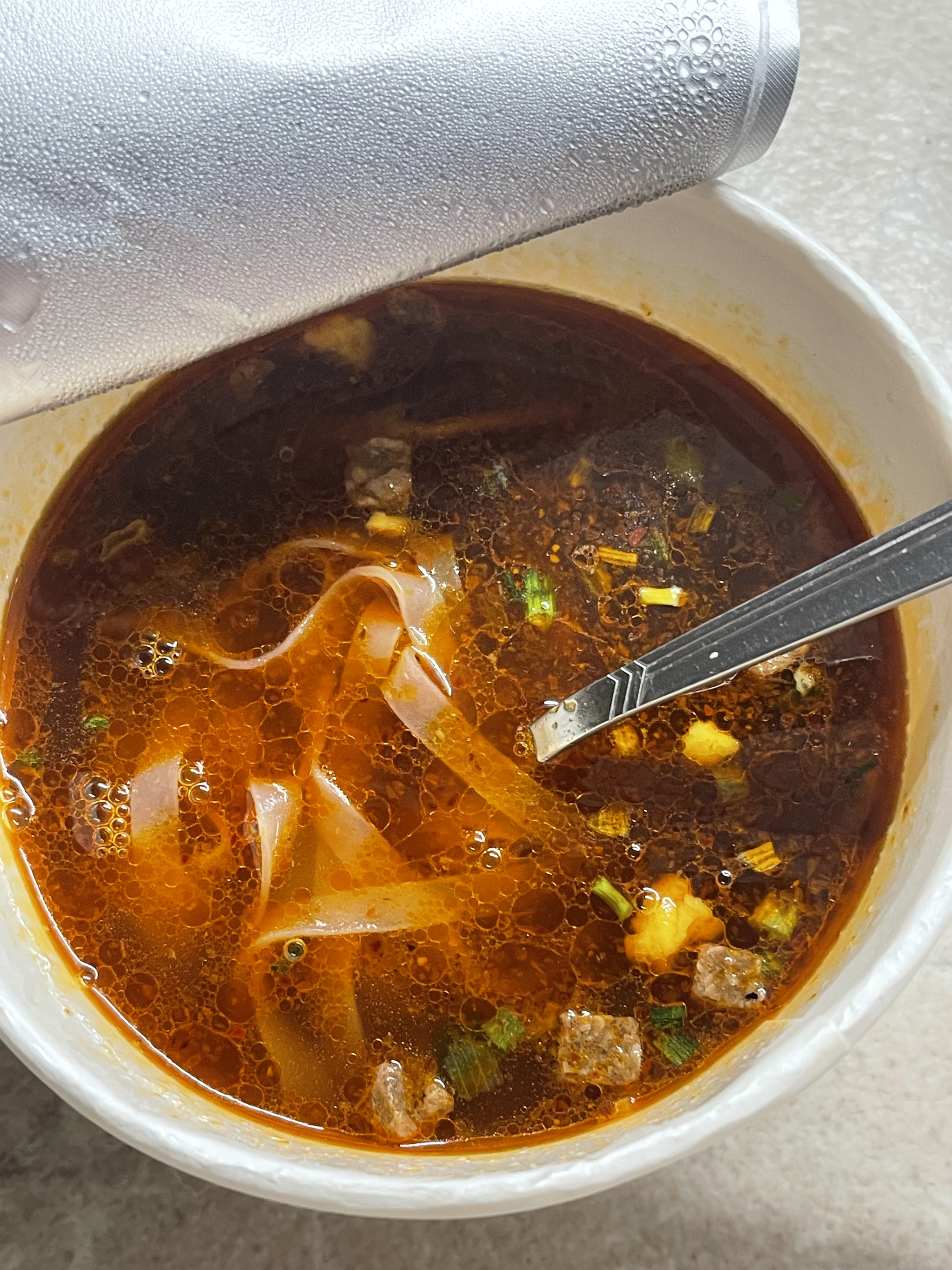 На выходе мы получаем вот такую лапшу. Бульон насыщенный, не острый и ооооочень жирный. Лапша не превратилась в сопли, напиталась бульоном и осталось чуть твердоватой.