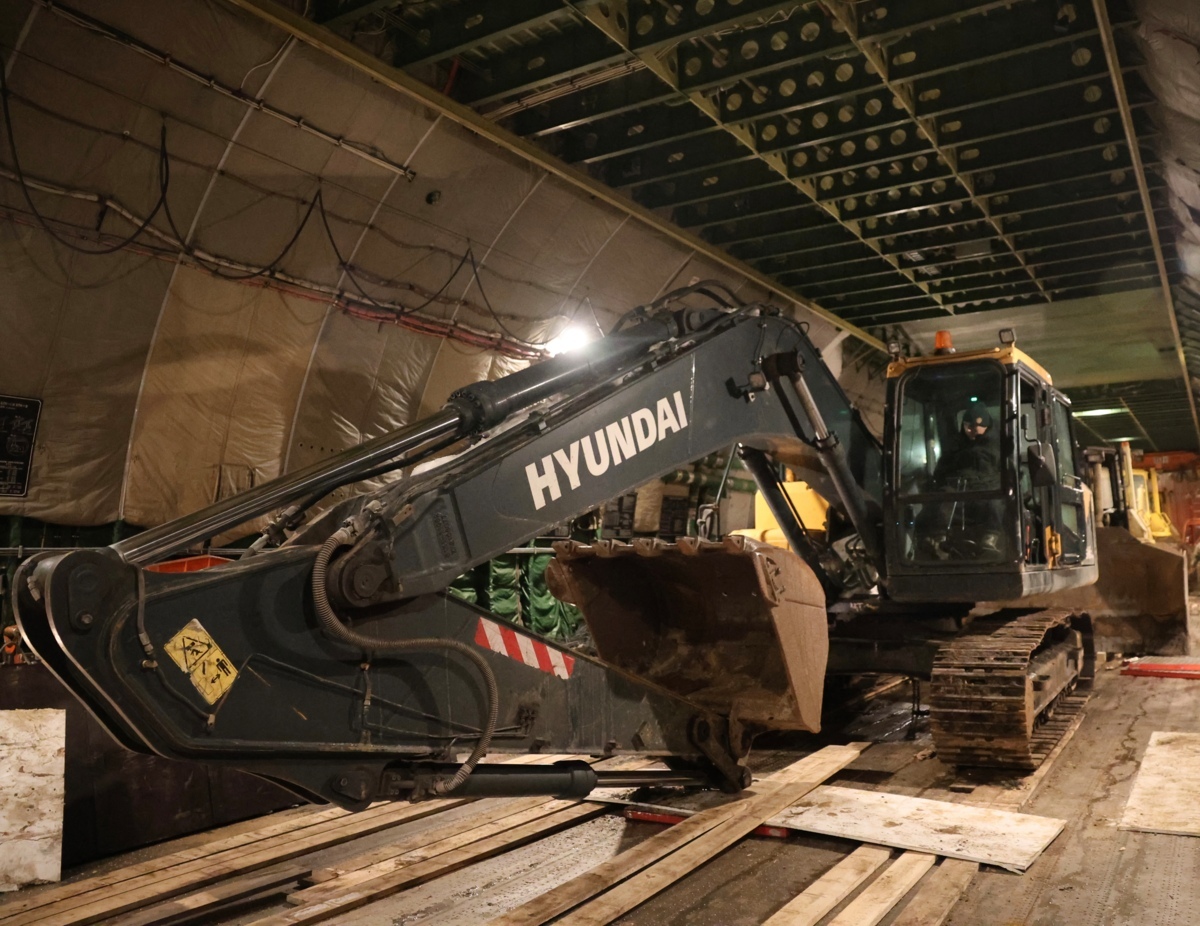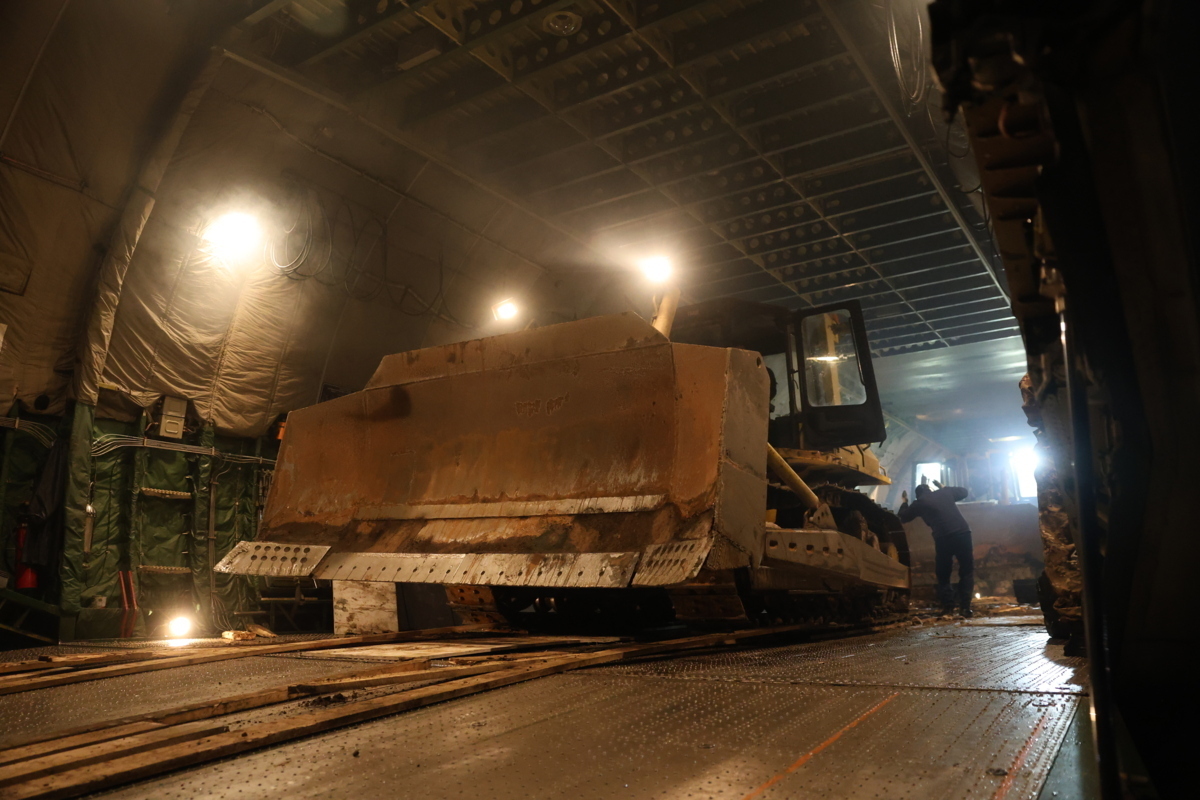 Фронтальный погрузчик доставлен на полуостров бортом МЧС России. Ещё одна партия – один экскаватор и три бульдозера – доставлены военно-транспортным самолётом Ан-124 «Руслан», выделенным Министерством обороны Российской Федерации.