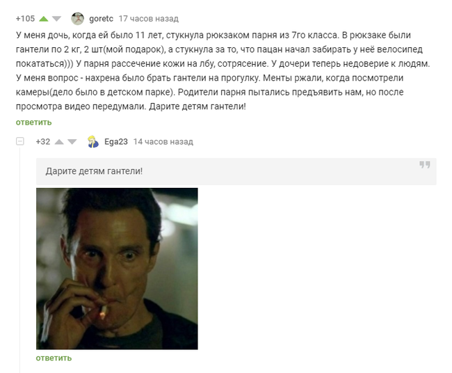 3097 SerGr55 Дети и родители Дарите детям гантели! 4 года назад #comment_200599195@goretc, @Ega23 вы в телевизоре :)П.С - Вопрос, зачем брать гантели на прогулку всё равно витает в воздухе :) Комментарии Скриншот Хулиганство Подарки Родители и дети Комментарии на Пикабу 22 13 2 2 Ещё 0