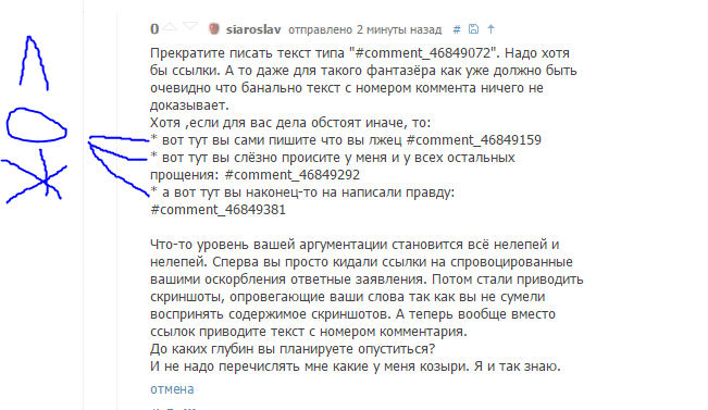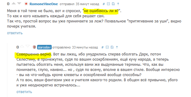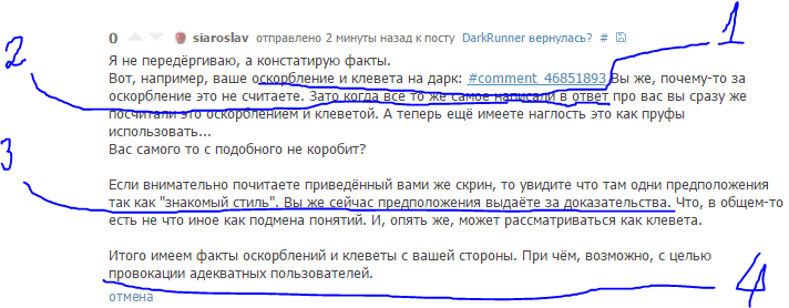 Круто вы всё перевернули. 1) Дайте скрин с подчёркнутыми оскорблениями, я хочу это увидеть, а то ссылка на мой комментарий совершенно ничего не показывает, точнее показывает отсутствие оскорбления или подобие.