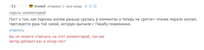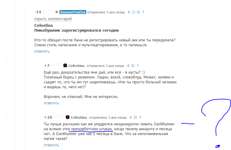 Да всё я прочитал, мне хотелось развёрнутого ответа, а то тут обычно всё скатывается к оскорблениям и клевете. Кстати странно что ДаркРаннер\Селестина сюда не заходит, в бан она меня закинула но не я.