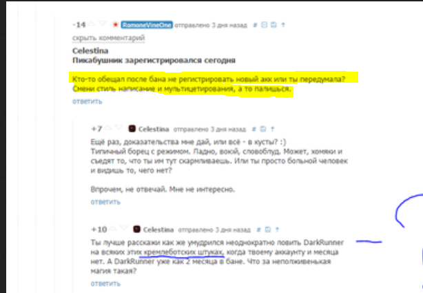Доказательства? - косвенные я уже привёл в посте. Более того, я с ней пообщался и убедился что @DarkRunner и @Celestina - одно лицо. Вы не обязаны мне верить, это интернет, тут всё должны подвергать сомнению. Прямые доказательства надеюсь найдут в админке. В support@pikabu.ru, я уже написал.