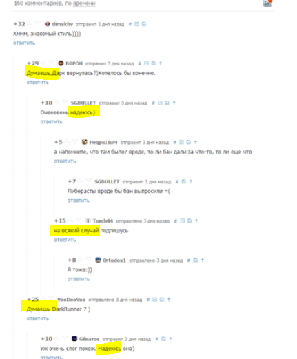 Кстати, тут пост ДаркРаннер потёрли, а там ещё пару людей высказали мнение что автор - ДаркРаннер. Как думаешь, её саму снова забанили или просто её пост нарушил какие-то правила? -