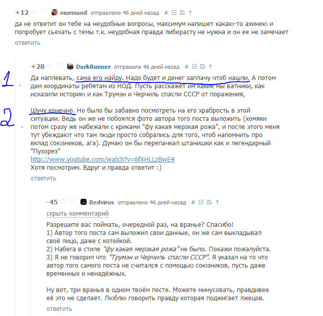 Может я и дурак, что рефлексирую на подобную тему, но я в отличии от неё не вру и не передёргиваю слова оппонента.