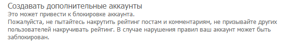Пожалуйста, не надо Создавать дополнительные аккаунты Это может привести к блокировке аккаунта.<-тут точка Пожалуйста, не пытайтесь накрутить рейтинг постам и комментариям, не призывайте других пользователей накручивать рейтинг. В случае нарушения правил ваш аккаунт может быть заблокирован.