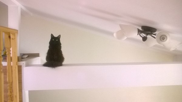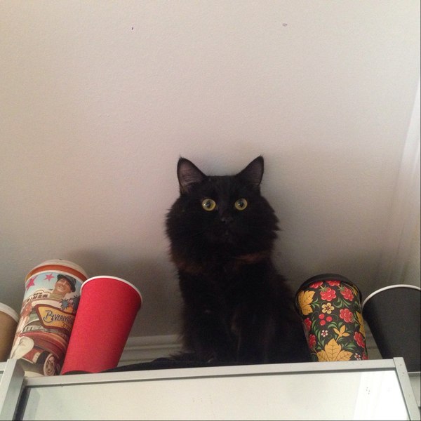 Еще он любит запрыгивать неизвестным нам образом на шкаф и сваливать мои стаканчики