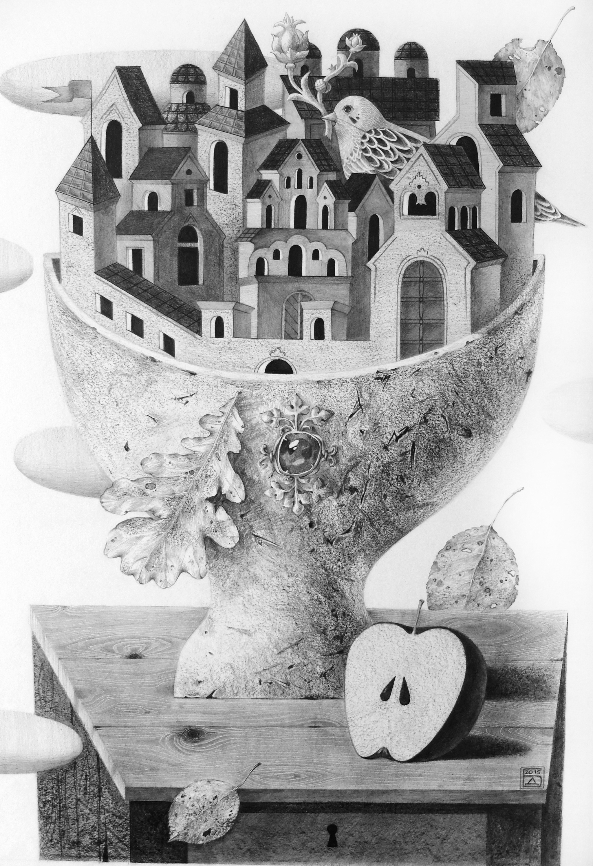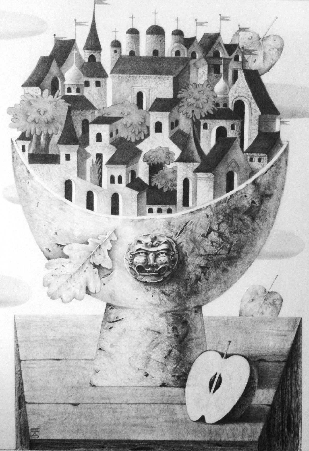 Работу я вела в основном карандашом - мне было очень интересно с этим материалом, интересно, а что я смогу из этого ограниченного инструментария (карандаш, ластик, бумага) выжать? До сих пор считаю, что одного карандаша достаточно, чтобы выстроить целый мир.