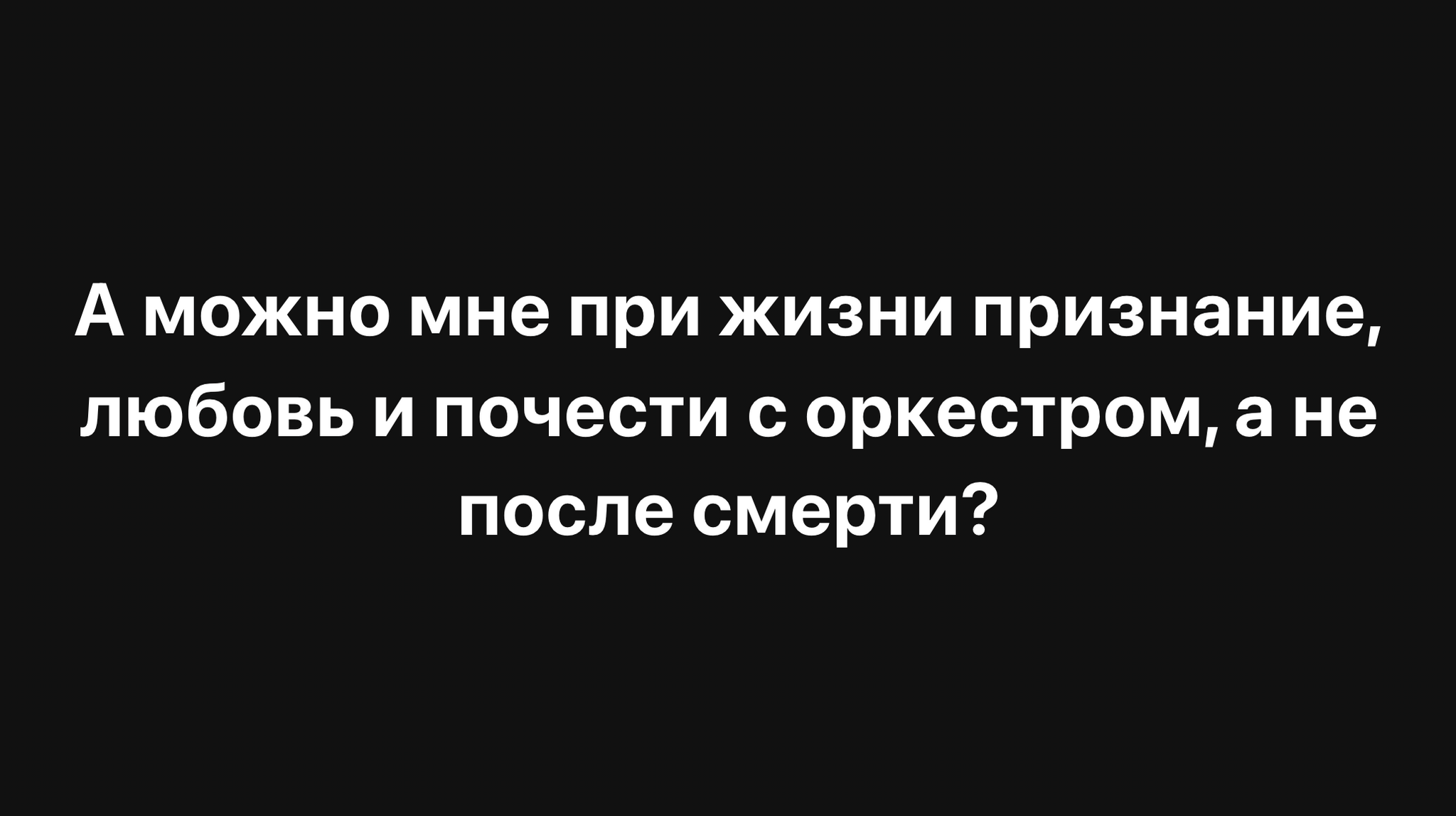 6 Yagodzinsky Психология | Psychology Давайте наоборот? 10 месяцев назад А можно мне при жизни признание, любовь и почести с оркестром, а не после смерти? [моё] Картинка с текстом Признание Смерть Жизнь 1 1 Ещё 0