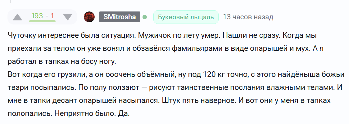 Пока спускали с лестницы, не покидало ощущение, что мужик как будто живой. Хоть уже и вздулся от скопившегося в брюшной полости газа. Видели зомби когда-нибудь? Я нет. Но если бы меня попросили представить, то первым делом на ум пишло бы вот это тело, которое я загружал в старенький УАЗ фермер.
