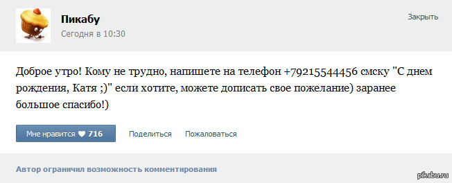 unzero 12 лет назад Давайте поздравим Катю! Админ группы "Пикабу" ВКонтакте опубликовал одну просьбу. На моей памяти у пользователей ничего никогда не просили. Поможем? Лига добра День рождения Админ СМС