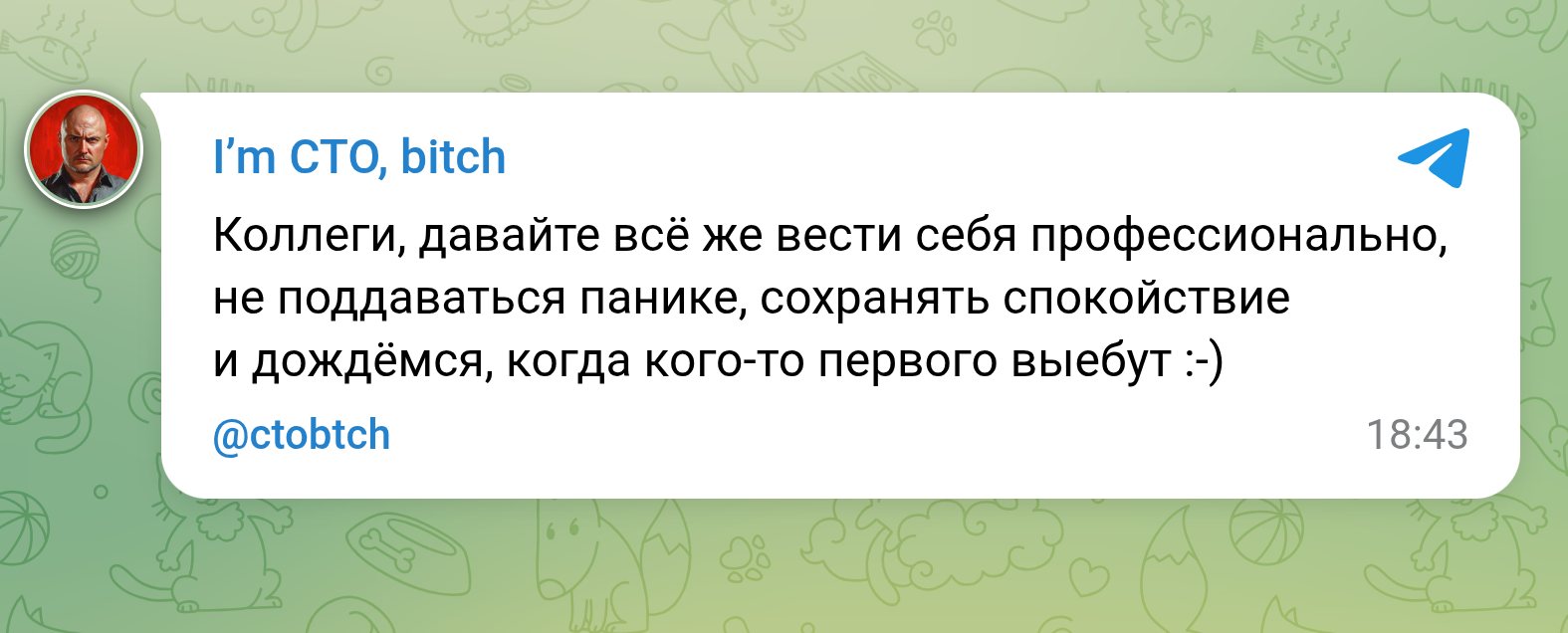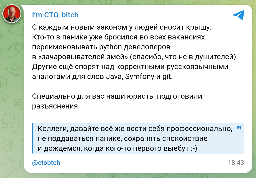 370 imctobitch Норм автор Юмор для всех и каждого Юриспруденция Давайте вести себя профессионально2 Серия I'm CTO, bitch 20 часов назад Отдельно картинка на случай важных переговоров (сохрани, год только начался): 🔥 Телеграм-канал / Канал в MAX [моё] I`m CTO bitch Запрет Закон Русский язык Профессиональный юмор Мат Скриншот Лига юристов IT юмор Symfony Git Java Python 85 8 6 Ещё 0