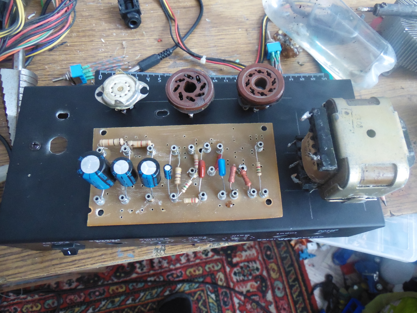 Был у меня халявный Ерасов Е-39,кажется. Играл на нем дома, от нечего делать. Потом попробовал vst-плагины, после которых звучание Ерасова вызывало тошноту, головокружение и приступы тошноты. Было решено переделать под что то ламповое и простое. Выбор пал на данную схему из-за ее простоты и дешевизны. Как видите - тут нету даже темброблока, впоследствии на мой вкус, он и нафиг не нужен оказался.