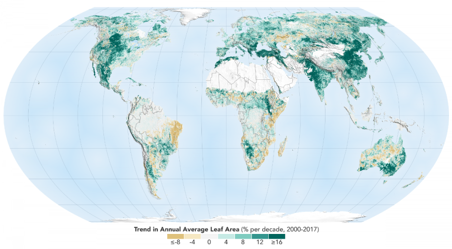 Алексей, мало кто знает, но сегодня Земля зеленее, чем была 20 лет назад (с поправкой на пару лет). Карта отрисована по данным спутников NASA. Зелёного на планете стало больше – ни за что не догадаетесь – благодаря Китаю и Индии, ударными темпами высаживающим у себя деревья.