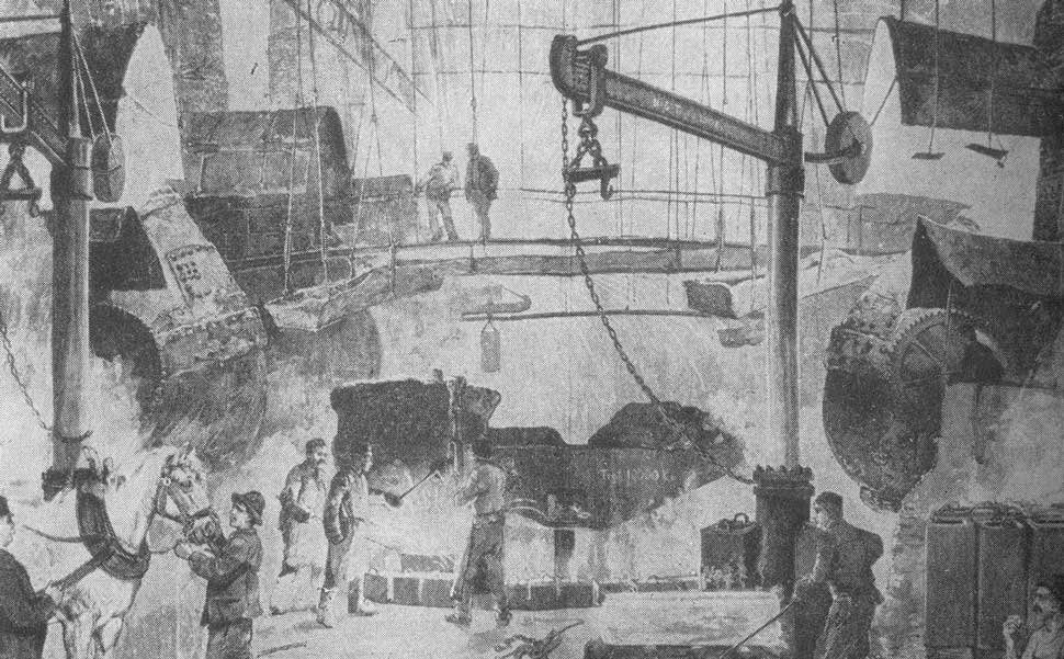 Бессемеровский цех на заводах Круппа. Метод Бессемера позволял получить материал нового качества, но общедоступным и востребованным он стал в силу того, что обеспечивал невиданную раньше производительность, поэтому распространялся довольно быстро