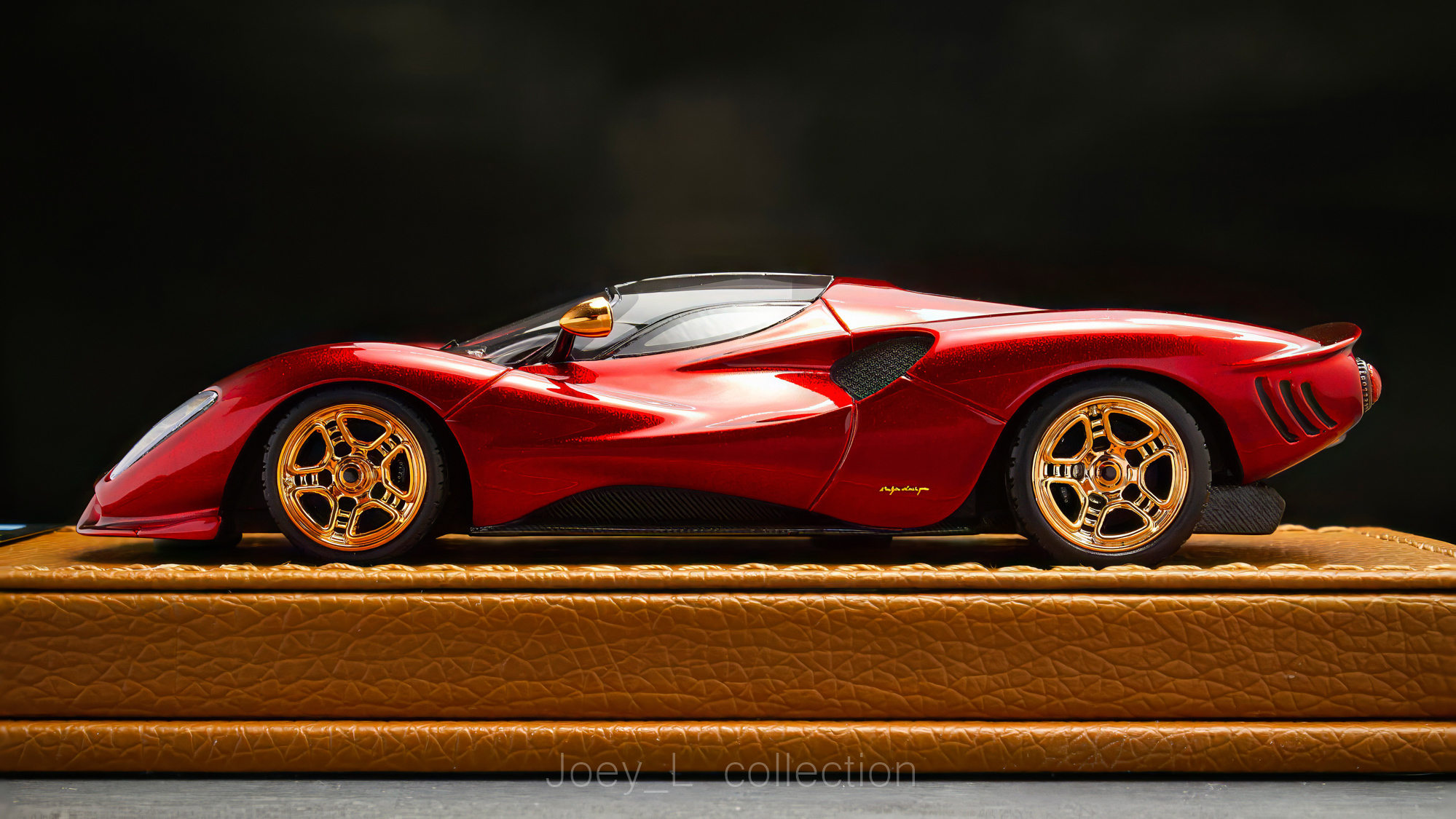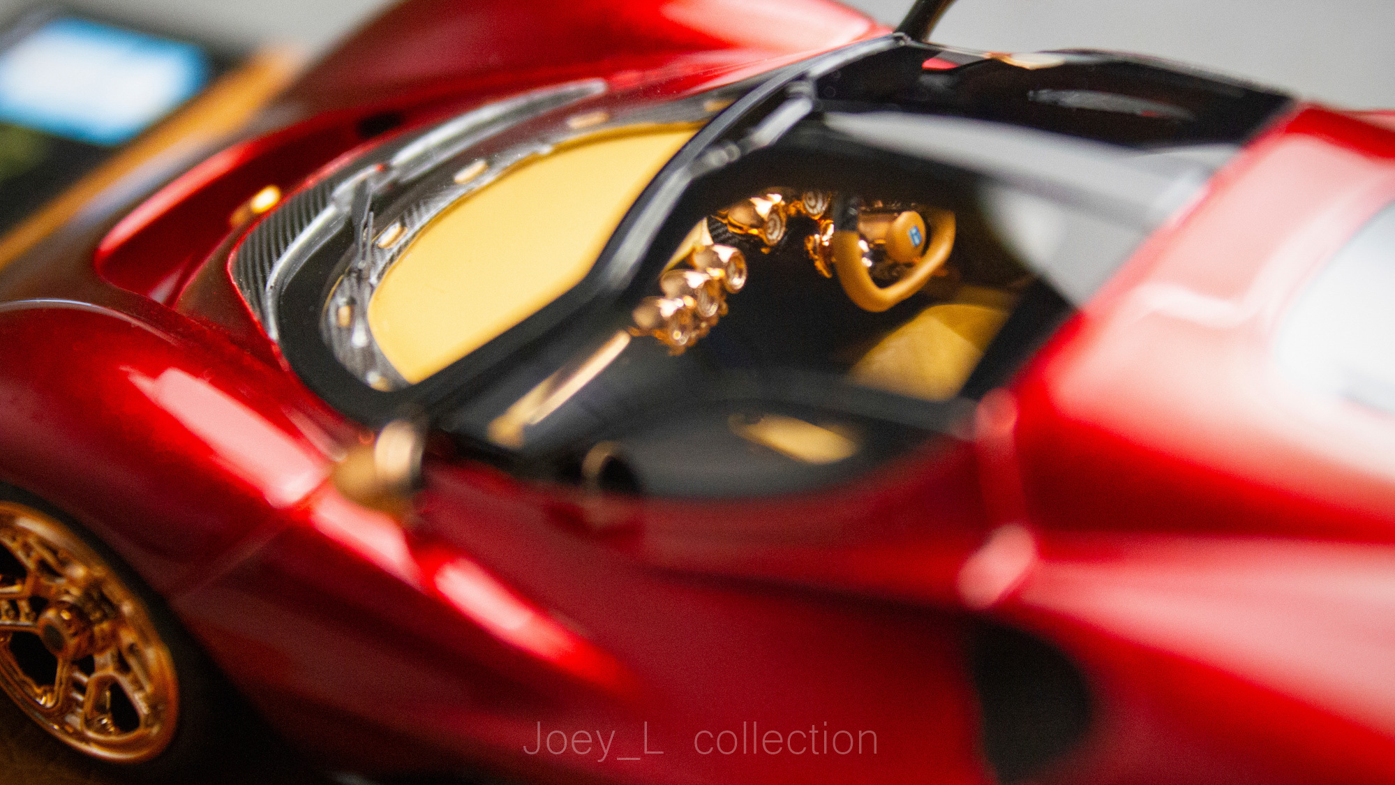 Данная модель определённо входит в тройку самых красивых моделей в моей коллекции. Дизайн экстерьера меня просто покорил. Да, он кричащий, яркий и даже китчевый, но при этом в нём чувствуется сильное влияние дизайна гоночных автомобилей конца 60-х, особенно Ferrari P3 и P4, Chaparral 2D, Bizarrini GT, Ford GT MkIV, которые мне также очень симпатичны. Очень нравится тонкие сетки с Y-образной плетёнкой, о решения производителя Peako симуляции наличия двигателя за задней сеткой. Хочу отметить великолепную покраску, эффект от впечатляющего металлика невозможно передать на фотографии, все переливы и блеск цвета нужно наблюдать вживую при ярком освещении. Над салоном тоже постарались, хотя ремни сделаны декалями, а не отдельными элементами. Сборка и клиренс у модели также на достойном уровне. Великолепная модель не сможет оставить равнодушным ни одного зрителя.