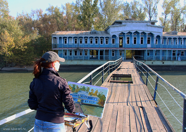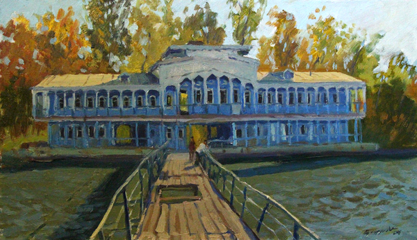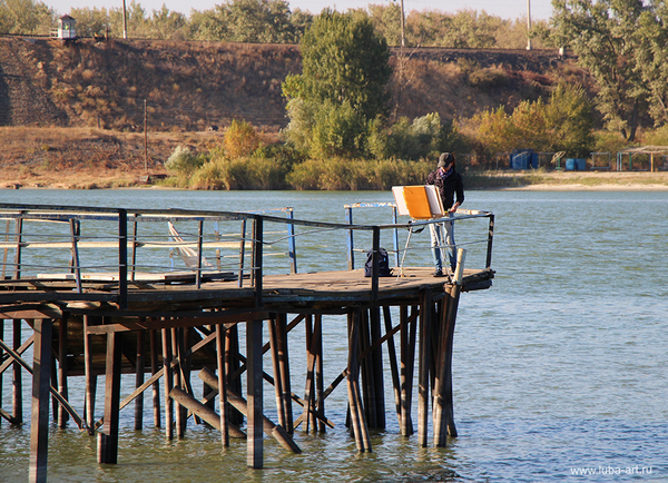 Пройдя по ненадежному настилу моста, выходящего в Дон, можно увидеть дебаркадер во всей его красе. Этот вид я и выбрала для своего этюда.