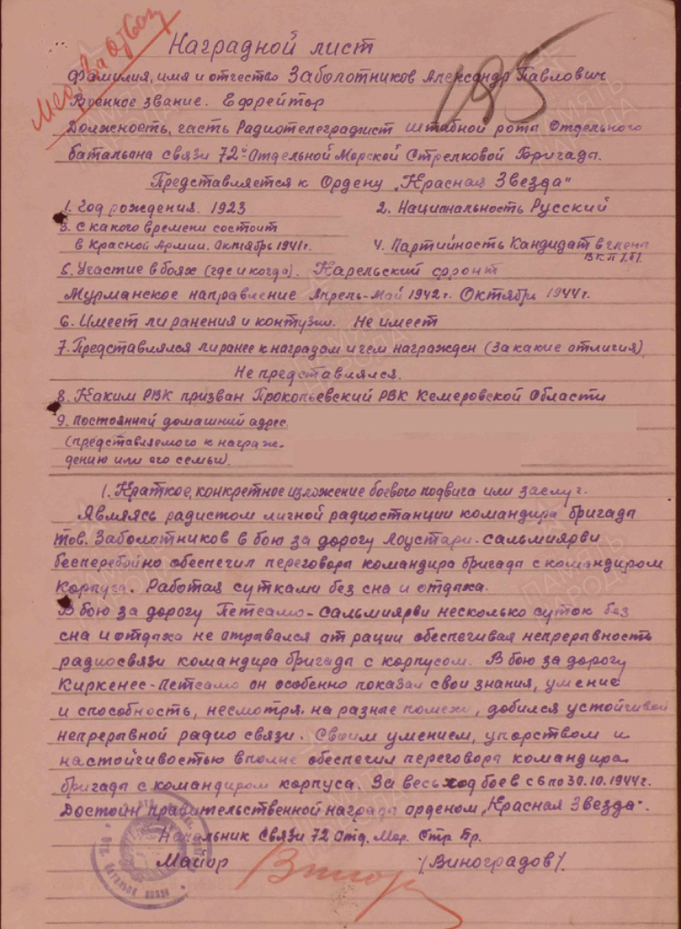 Мой дед Заболотников Александр Павлович. Ушёл на фронт в октябре 1941 года в возрасте 18 лет. Служил радиотелеграфистом штабной роты Отдельного батальона связи 72 Отдельной Морской Стрелковой Бригады в звании ефрейтора. Получил медаль «За Отвагу», 2 Ордена Красной Звезды. Был тяжело ранен. Вернулся с фронта в сентябре 1946 года.