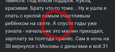Вспомнилось. 31 декабря (91 или 92), полдень. На столе какое-то простенькое угощение. Понурый отец, пытающаяся шутить мама. Старший брат и вовсе поник. Я маленькая, года 4. Бегаю, новый год же. Спрашиваю что-то про деда мороза. Мне как-то невнятно отвечают, но мне и не важно. Звонок в дверь, а там Дед Мороз! Настоящий, с бородой, в кафтане каком-то. И подарки у него не в мешке, а в пакете. Меня на стул - стих читать! А я радёхонькая, дед мороз ко мне пришёл! И странно, подарок в пакете маме дарит, да и пакет какой-то тоненький. Прощается, говорит что подарок под ёлку ночью принесет, а сейчас поздравить зашёл ну и шоколадку дал. И уходит. Я в рев, но весёлый отец подхватывает меня, брата и идём гулять на улицу! А прогулки с отцом были редкими и очень счастливыми. Про подарок и забыла.... Домой зашли уже в темноте. Под ёлкой подарок. Кукла, красивая. Брату что-то тоже... Ну и ушла я спать с куклой самым счастливым ребёнком на свете. А́ спустя годы уже узнала - начальник это мамин приходил, зарплату за полгода принёс. Сам в ночь на 30 вернулся с Москвы с деньгами и всё 31 ездил и до ночи по сотрудникам деньги развозил. А чтоб праздник создать, шоколадки детям раздавал. А борода у него своя была) и фамилия у него Морозов. Спасибо ему. Я продолжала ещё долго верить что именно он был настоящим Дедом Морозом