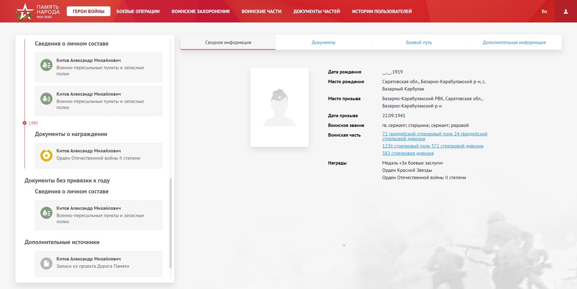 Тов. Китов в 1236 стрелковом полку сержант с 18.3.43г. С 20.4.43г. находясь в обороне показал себя дисциплинированным, ***тельным и инициативным командиром. 9.5.1943г. находясь на передовой линии обороны был легко ранен. По излечению 3.7.1943г. снова вернулся в полк и назначен на должность старшины роты. Участвуя в боевой операции 16.7.1943г. в районе деревни Гайтолово тов. Китов проявил мужество, отвагу и преданность своей родине. Увлекая за собой группу бойцов тов. Китов первым ворвался в немецкую траншею и в завязавшейся схватке уничтожил 13 немецких солдат и офицеров в том числе 11 из автомата, 2х ножом и их боевую технику. Будучи дважды ранен он продолжал истреблять засевших в блиндажах немцев и только после 3го ранения по приказанию командира был уведён с поля боя.