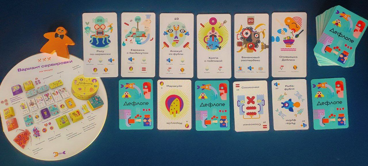 «Дефлопе. Битва за холодильник» — это карточная настольная игра с элементами ставок и динамичной гонкой за победу. Игроки становятся поварами в гротескном мире высокой кухни, пошагово собирая ингредиенты и покупая рецепты. Цель игры — первым набрать победные очки и получить Кубок кулинарного триумфа.