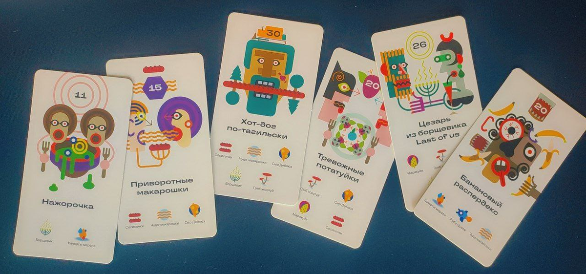 Ты прячешь золото под жёлтым ланчбоксом, выдвигаешь его вперёд, ловишь взгляды оппонентов — и вот уже кухня замирает в напряжённой тишине перед вскрытием ставок. Дальше — азарт торгов, хруст карт, отчаянные сделки и подлые уловки вроде «Плевка в борщ» или «Малыша тараканчика». Здесь выигрывает не тот, кто просто собирает ингредиенты, а тот, кто чувствует момент, рискует и вовремя подставляет другу-сопернику зубочистку под коленкой (она же не просто так входит в комплект))).