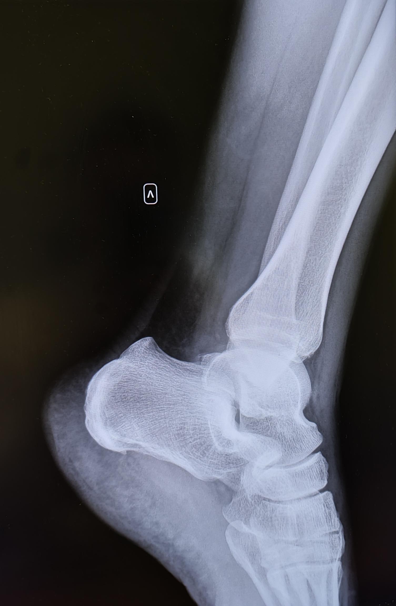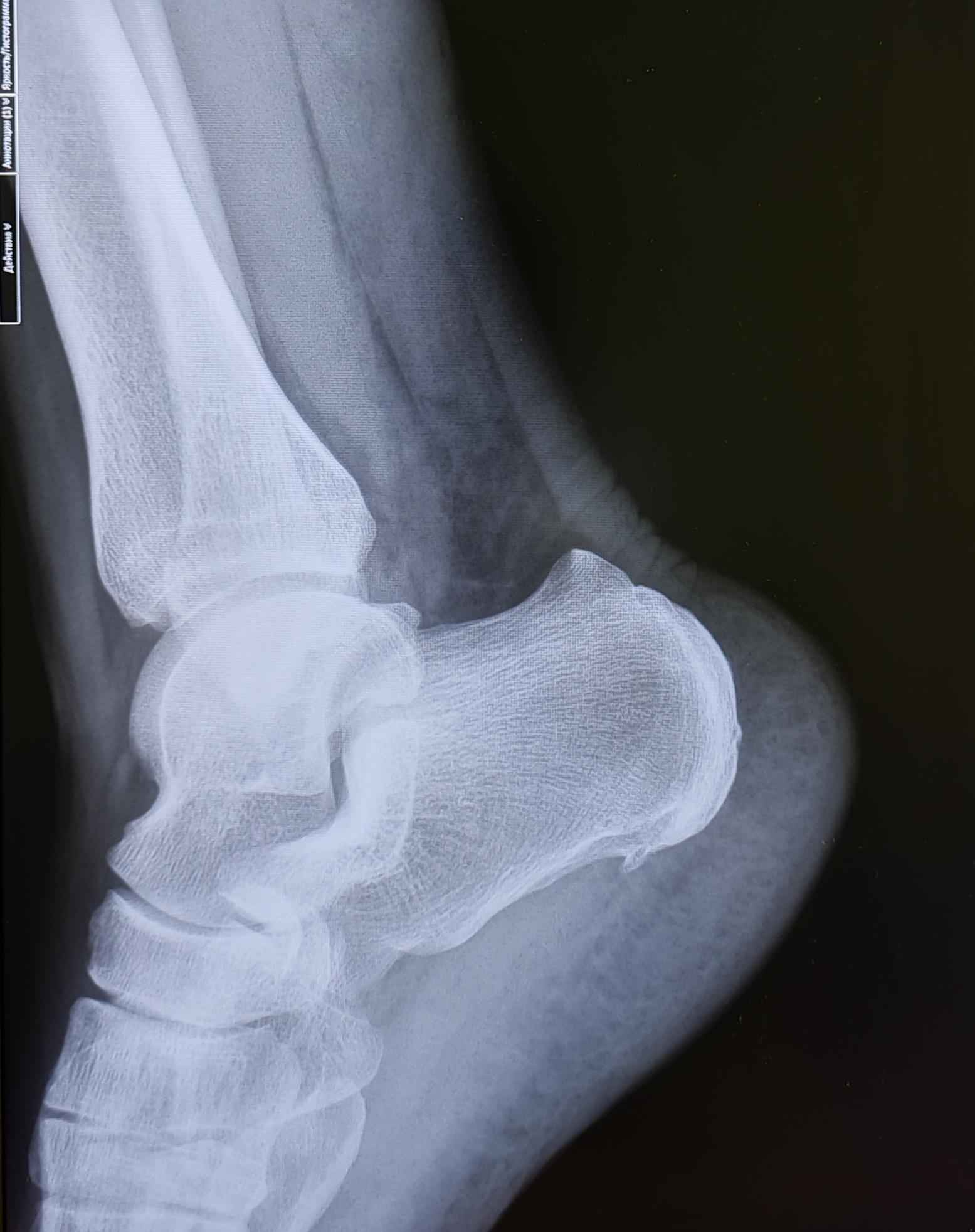 Описание: на Р-граммах правой и левой пяточных костей-травматических, деструктивных изменений не выявлено, структура костной ткани не изменена. В месте прикрепления подошвенных апоневрозов к буграм пяточных костей-визуализируются костные экзостозы. Верхняя часть бугров пяточных костей увеличена в размерах, имеет треугольную форму на широком основании. Заключение: Двусторонняя деформация Хаглунда. Двусторонние пяточные "шпоры".