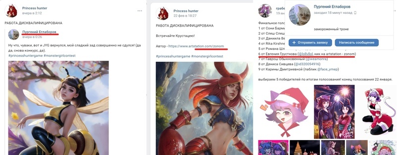 Ещё никогда Штрилиц не был так близко к провалу… Чтобы не утруждать вас сопоставлениями имён-явок-паролей, поясню: под шестым номером в конкурсе с какой-то работой участвовал аккаунт ВК, который “нарисовал” Осу… да только указанный Artstation принадлежал *барабанная дробь* нашему оскорблённому до глубины души, требующему справедливости и отбелить его честное имя, автору Криветки!