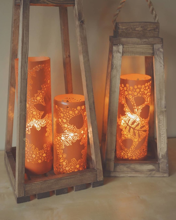 Довольно простой и очень эффектный проект – эти фонари из реек благодаря своему размеру станут отличным украшением интерьера! К тому же декор прощает небольшие косяки и неровности, поэтому всё обязательно получится даже у начинающих :)