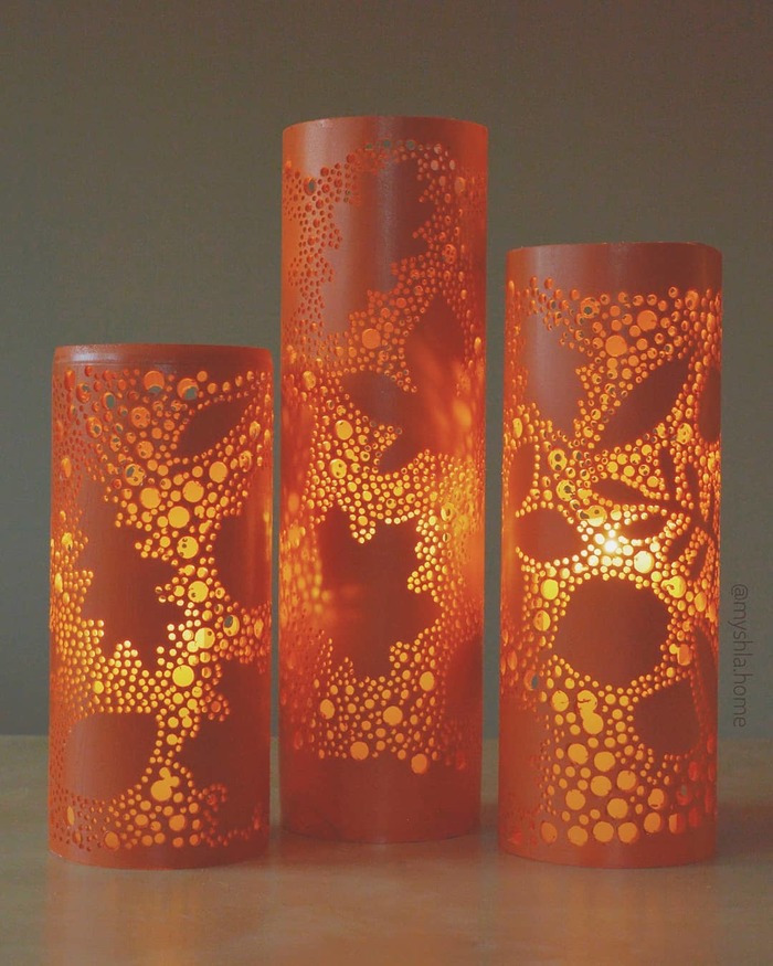 Внутрь можно поставить обычные свечи в стеклянных вазах или имитацию свечей на светодиодах. Я пошла чуть дальше и из обрезков канализационной трубы сделала вот такие светильники для осенней композиции на крыльце (внутри светодиодные свечи с таймером). Такие же можно сделать с рождественскими мотивами или с абстрактным орнаментом и использовать круглый год. По ним у меня тоже есть подробный мастер-класс, хотя там уж совсем все просто – шуруповерт, пара-тройка сверел и несколько часов свободного времени :)