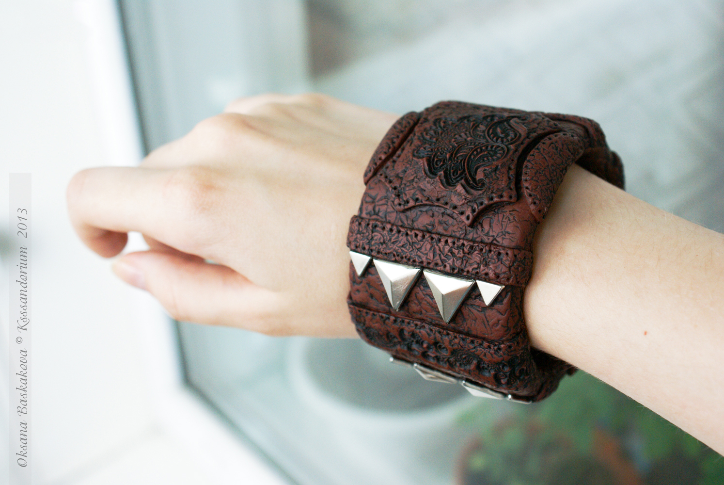 Браслет декорирован клёпками, а так же имитацией тиснения узоров на кожу горячими штампами.