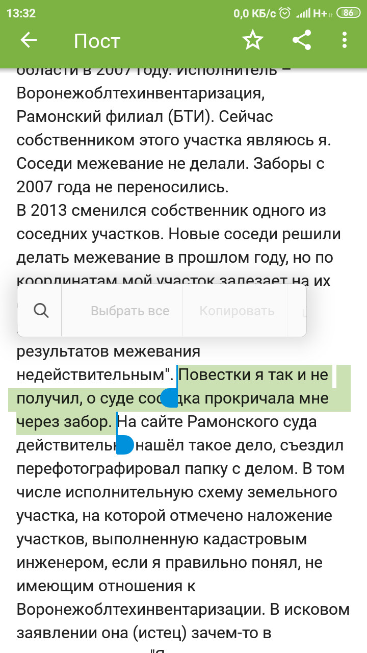 В 2013 сменился собственник одного из соседних участков. Новые соседи решили делать межевание в прошлом году, но по координатам мой участок залезает на их фактический (на 80м2). 13.04.21 они подали на меня в суд "О признании результатов межевания недействительным". Повестки я так и не получил, о суде соседка прокричала мне через забор. На сайте Рамонского суда действительно нашёл такое дело, съездил перефотографировал папку с делом. В том числе исполнительную схему земельного участка, на которой отмечено наложение участков, выполненную кадастровым инженером, если я правильно понял, не имеющим отношения к Воронежоблтехинвентаризации. В исковом заявлении она (истец) зачем-то в частности пишет "Я в подписании акта согласования местоположения границ земельного участка участия не принимала" при том, что межевание моего участка проводилось значительно раньше того, когда она купила свой участок. Ладно, это лирика. К сути. Межевание моего участка проводило местное БТИ. Смысла его сдвигать тем образом, о котором говорит истец для нас нет. Ни у меня, ни у родителей, которые были собственниками на момент межевания, нет ни инструментов, ни квалификации для проверки правильности межевания. В чём моя вина – мне непонятно. Рамонский филиал больше межеванием не занимается. Воронежская головная организация занимается. Встретился с кадастровым инженером, она говорит: если суд встанет на сторону истца, приходи с решением, я твои координаты сдвину бесплатно. Как мне представляется исход событий: Координаты раньше снимали другими инструментами, с высокой долей вероятности если переснять мой участок новыми, координаты действительно окажутся неправильными. В результате суд встанет на сторону истца, возможно (но не уверен), БТИ бесплатно исправит мои координаты, но на меня повесят все судебные издержки, в том числе истца, о которых она так многозначительно кричала через забор. Платить за ошибку БТИ своими деньгами я не хочу, даже если такая есть.