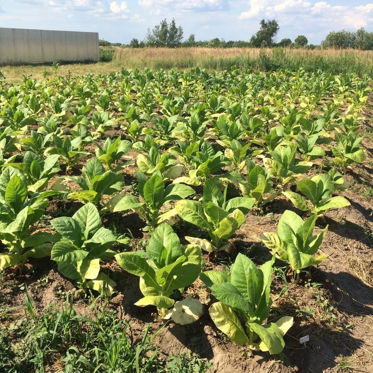 Поздняя высадка, отсутствие дождей сильно тормозило рост. Табак начинал желтеть на корню. Но полив и подкормка дали результат и теперь плантация выглядит вот так: