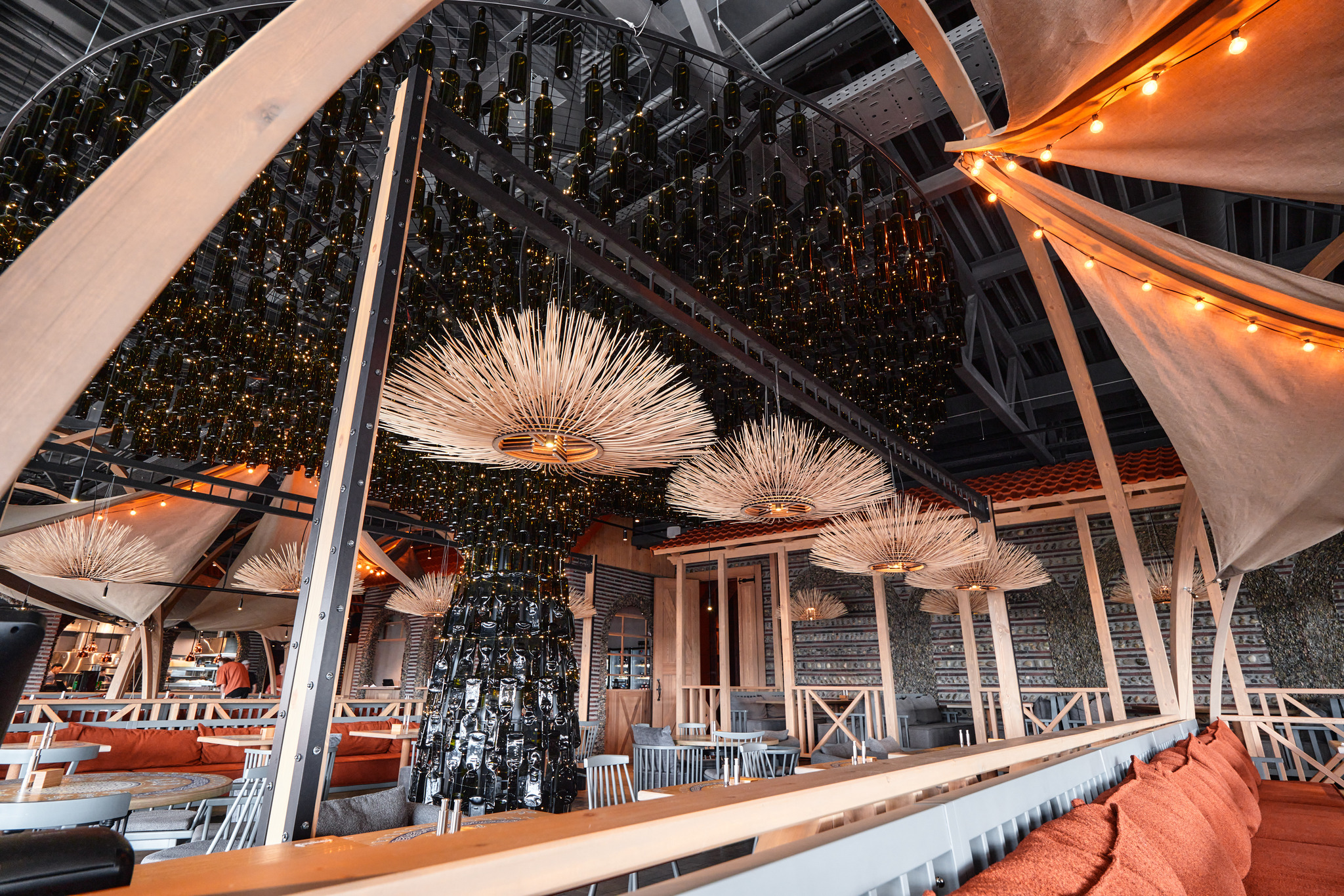 Инсталляция из сотен бутылок в центре зала ресторана грузинской кухни в Красноярске
