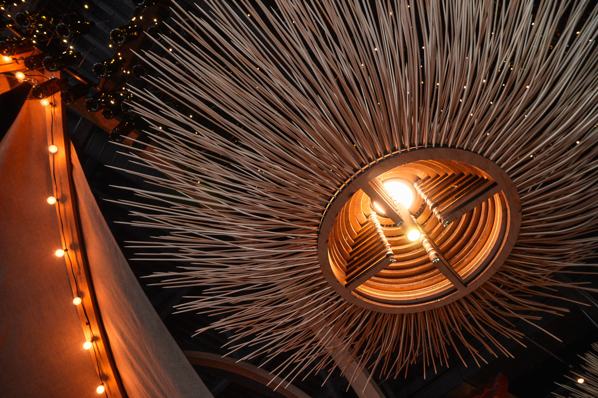 В этом же ресторане еще и стилизованные под папаху светильники из натурального дерева, в количестве нескольких десятков на все заведение: