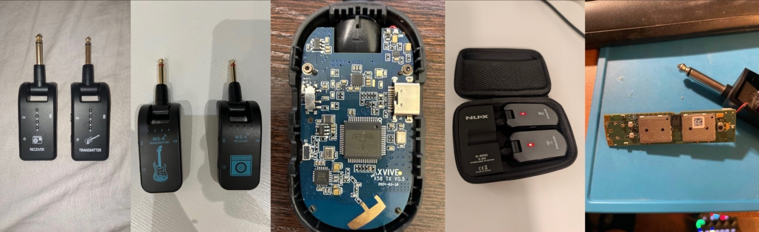 Слева направо: дешёвая система 1, дешёвая система 2, подразобраная XVive A58, Nux C-5RC, разобранный Sennheiser XSW-D