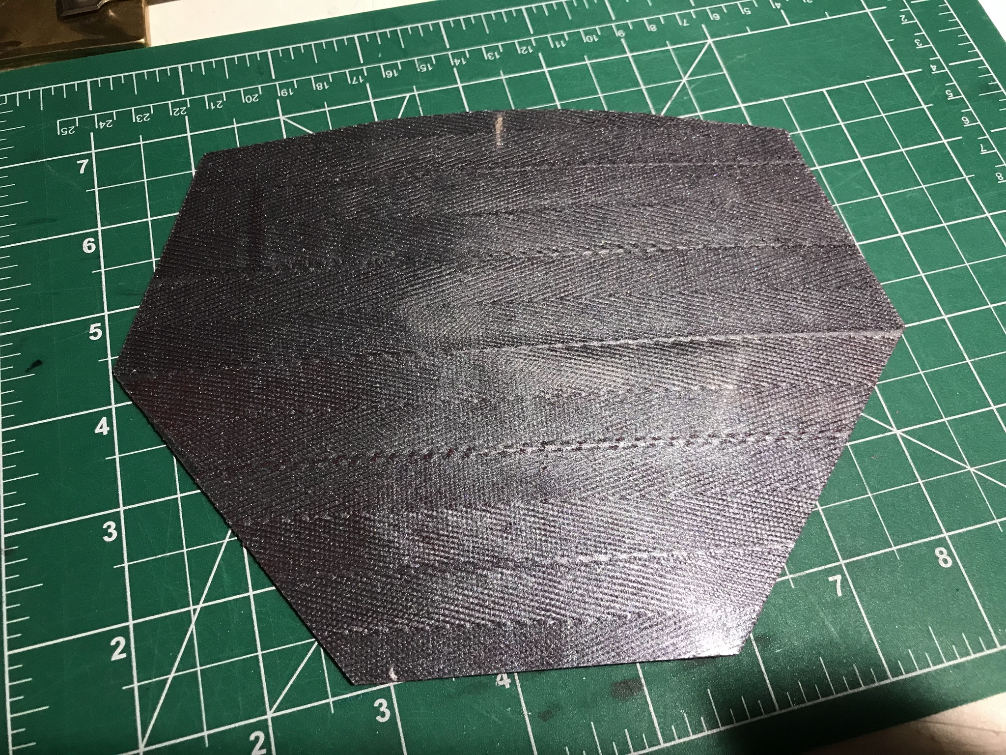 А теперь к ошибке - на первом этапе, как получили базовый контур пластины на стеклоткани надо было не дожидаться полного отверждения, а вынимать ее из пластика на моменте, когда смола уже не клеится, но еще мягкая. и тогда придавать форму. И это я реализовал на наплечнике